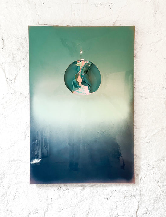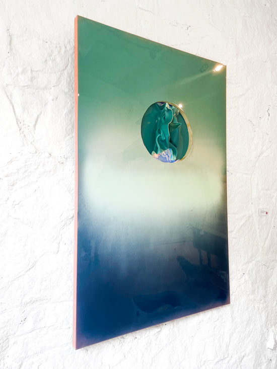 Reclaimed wood from the Darlington Atlanta, reclaimed canvas, and reclaimed paint, plexiglass topped with resin