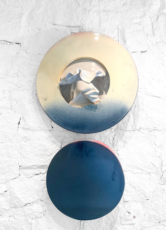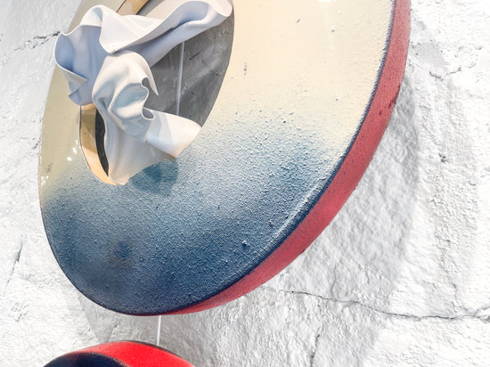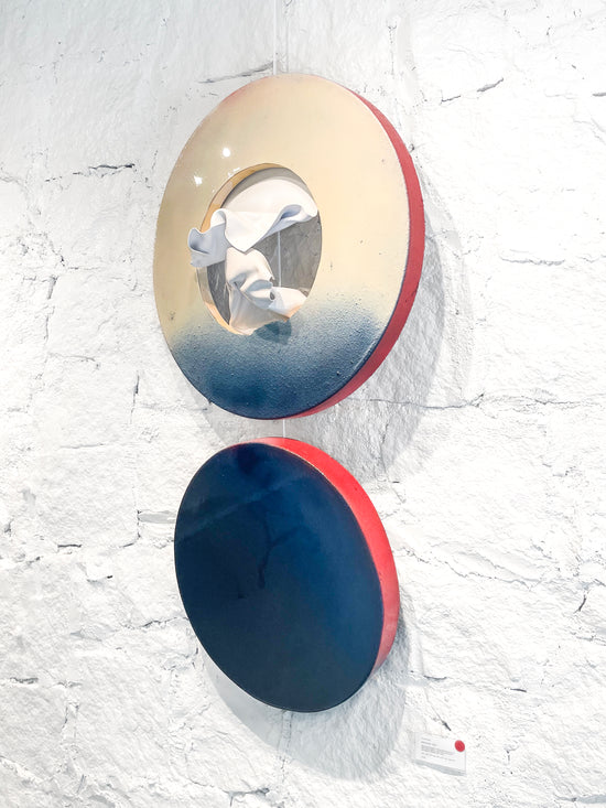 Reclaimed wood, reclaimed canvas from Memento Gallery, and reclaimed paint, plexiglass topped with resin
