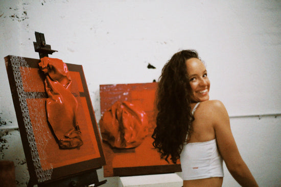 Reclaimed wood, reclaimed canvas from Memento Gallery, and reclaimed paint, plexiglass topped with resin